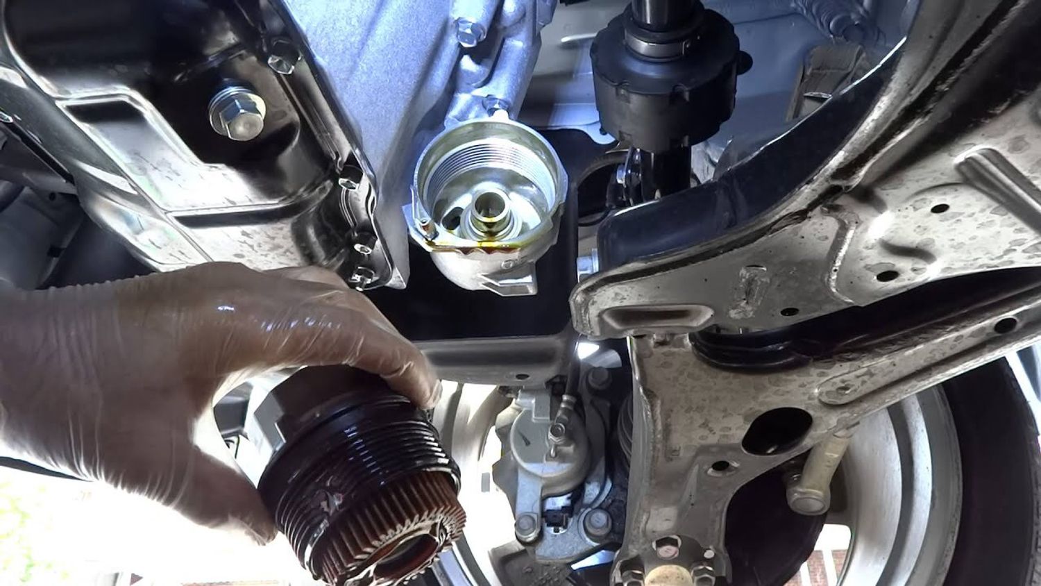 Будьте готовы к тому, что сразу после отворачивания польется немного масла (возможно – горячего!!!), которое может попасть на одежду или на открытые участки тела. Проявляйте осторожность и не спешите. Как только открутите старый фильтр, его можно положить отверстием вверх или перевернуть, предварительно убрав в пустую емкость для технических жидкостей.