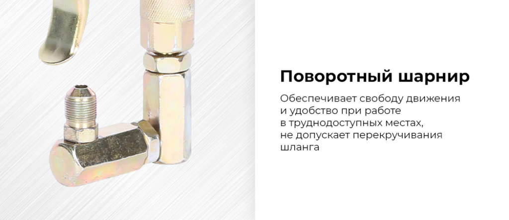 • Поворотный шарнир — обеспечивает свободу движения и удобство при работе в труднодоступных местах, не допускает перекручивания шланга;