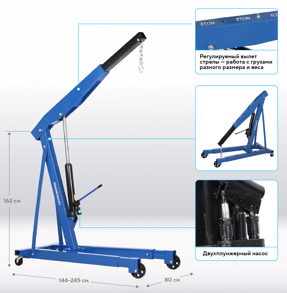 Предназначен для подъёма и перемещения автомобильных узлов, агрегатов и других грузов массой до 3 тонн. Оснащён гидравлическим цилиндром с ручным управлением, обеспечивающим плавный подъём и опускание груза.