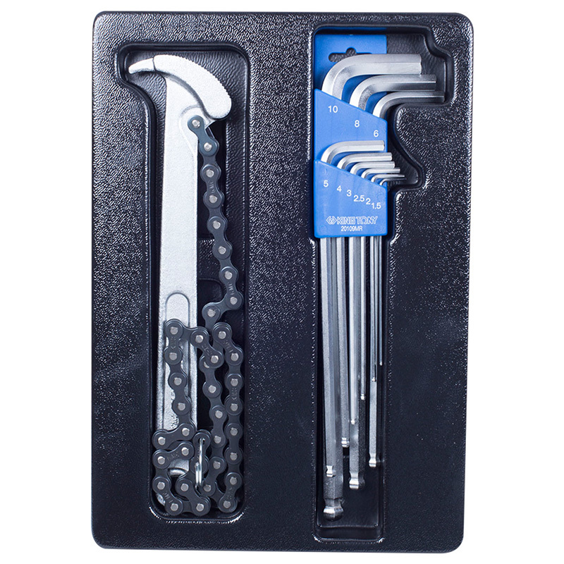 Набор шестигранников Г-образных и съемник масляных фильтров, ложемент, KING TONY 9-20110MR состоит из угловых ключей и цепного съемника. Представленный комплект подходит для использования в профессиональной сфере по ремонту и обслуживанию автомобильного транспорта. Изделия расположены в ложементе и станут оптимальным дополнением к инструментальной тележке.
