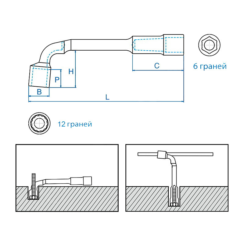 • Удлиненная торцевая часть имеет 6-гранный профиль, другая 12-гранный профиль.