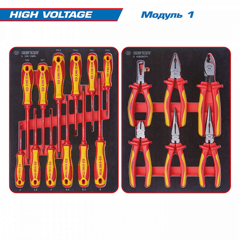 Набор инструментов "HIGH VOLTAGE" для тележки, 6 ложементов, 117 предметов KING TONY 932-117VEMRVD.