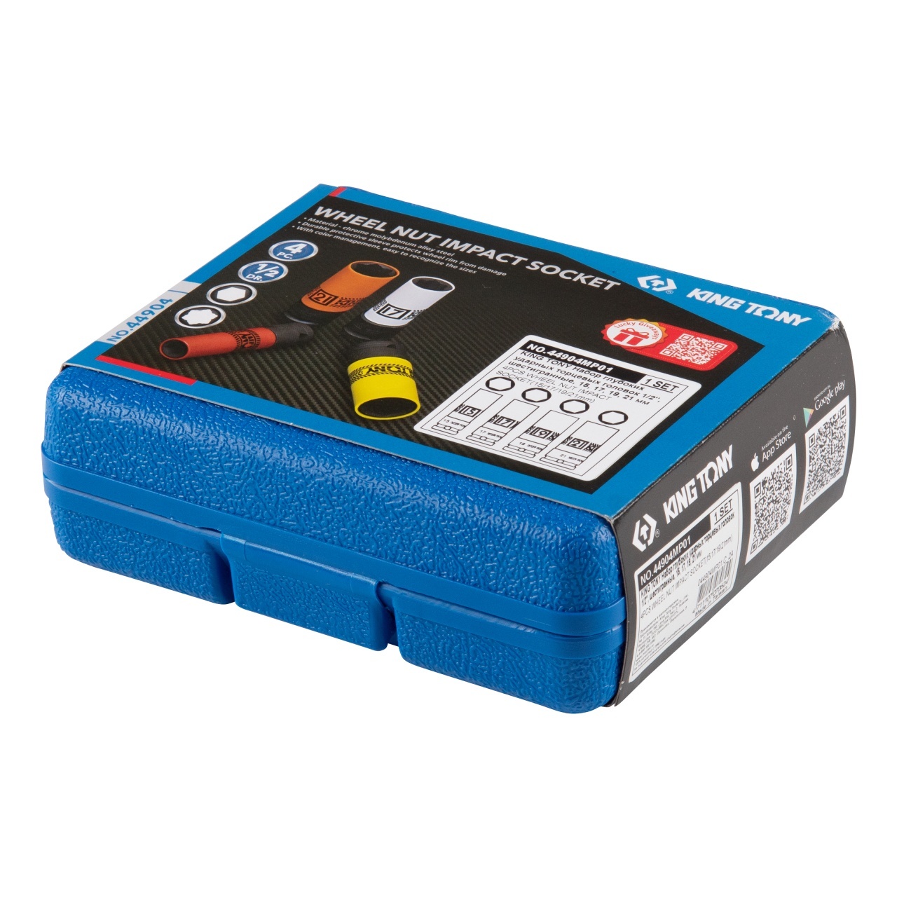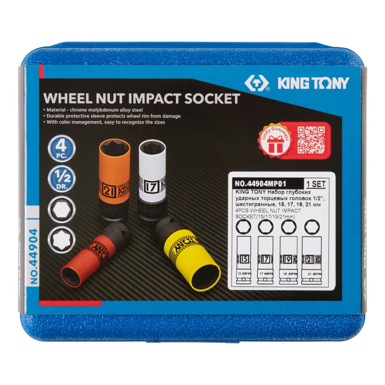 KING TONY (44904MP01) Набор глубоких ударных торцевых головок 1/2", шестигранные, 15, 17, 19, 21 мм