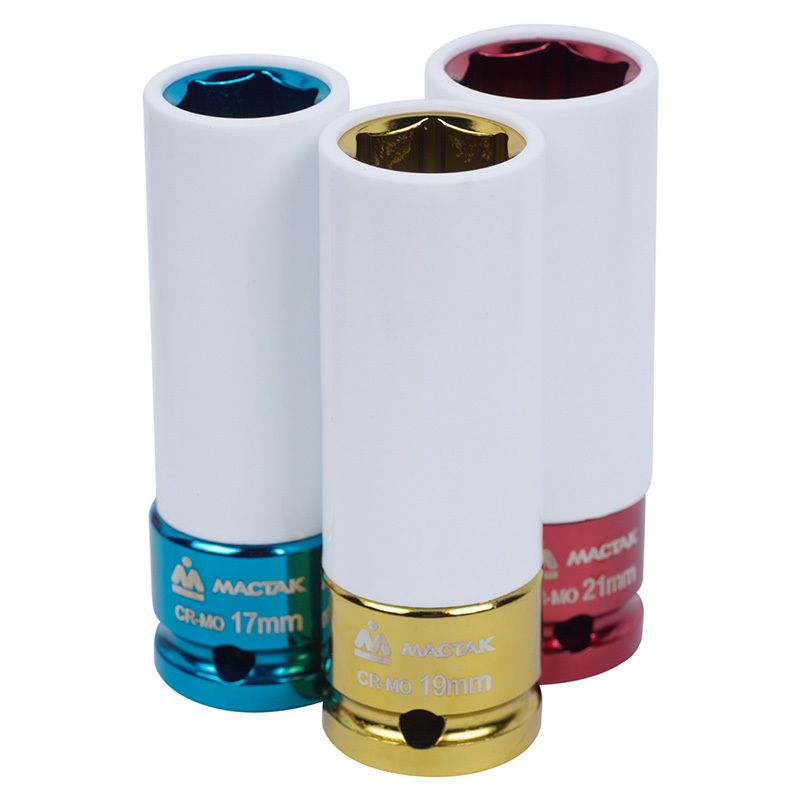 • Головки торцевые ударные тонкостенные шестигранные глубокие с пластиковым покрытием 1/2": 17, 19, 21 мм.