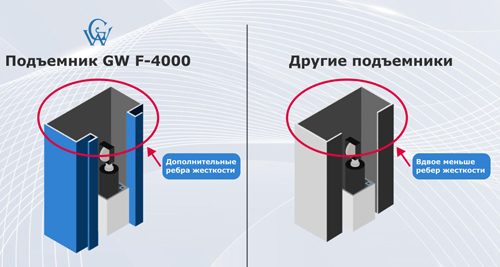 Для продления срока службы и улучшения надежности подъемника, каретка модели GW-F4000 220 имеет усиленную конструкцию, что достигается за счет использования металла увеличенной толщины и ширины каретки. Такие меры способствуют снижению износа и рискам деформаций при максимальных нагрузках.