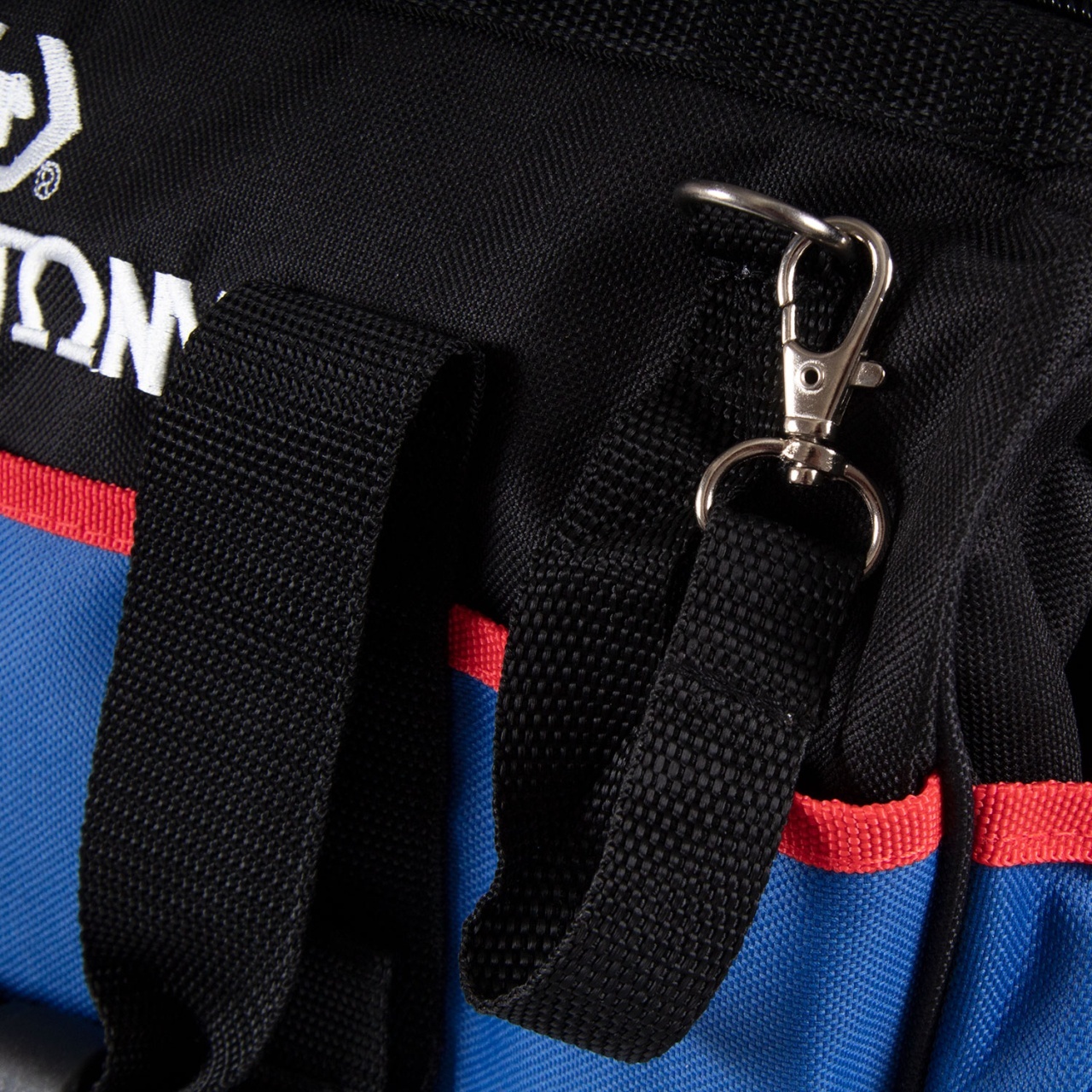 Сумка изготовлена из износостойкого, водонепроницаемого полиэстера 600D. Помимо широкого основного отдела, имеет дополнительно 8 внешних и 8 внутренних карманов. Водонепроницаемая основа из резинопластика защищает инструменты во время работы в условиях повышенной влажности. Сумка имеет регулируемый плечевой ремень, который при необходимости можно снять, отсоединив карабины.