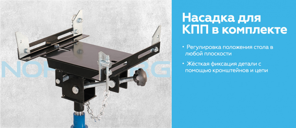 • Установочная регулируемая платформа 34х34 см вместо обычной приёмной насадки позволяет надежно расположить на ней агрегаты. Благодаря удобным регулировкам, платформа может изменять длину и ширину расположения ограничителей для лучшего захвата агрегата, а также изменять угол наклона, тем самым позволяя подстроиться под различные конфигурации демонтируемых/монтируемых узлов. Также платформа имеет цепь для обвязки агрегата с целью его жесткой фиксации на платформе во избежание падения агрегата со стойки во время снятия или установки на автомобиль.
