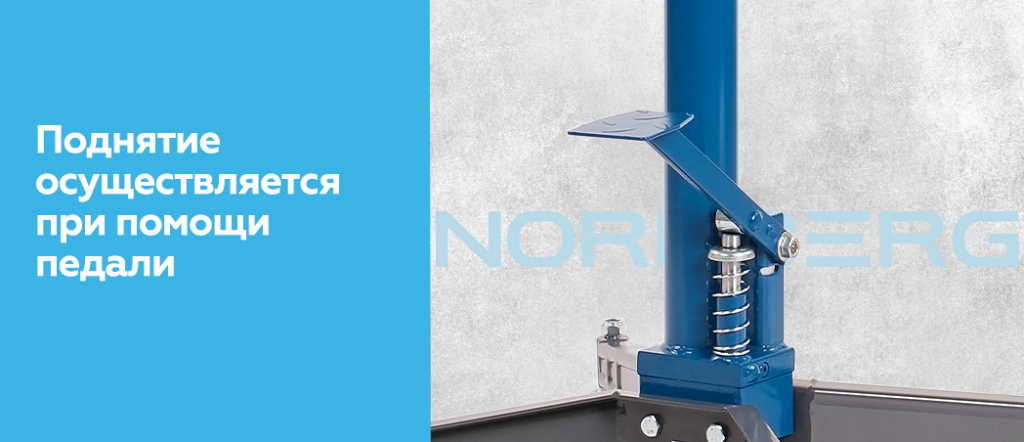 • Управление гидравлическим приводом поднятия платформы при помощи педали, а также управление спуском простым отворачиванием одной рукой специальной металлической рукоятки позволяет лучше контролировать положение агрегата при вертикальном положении.