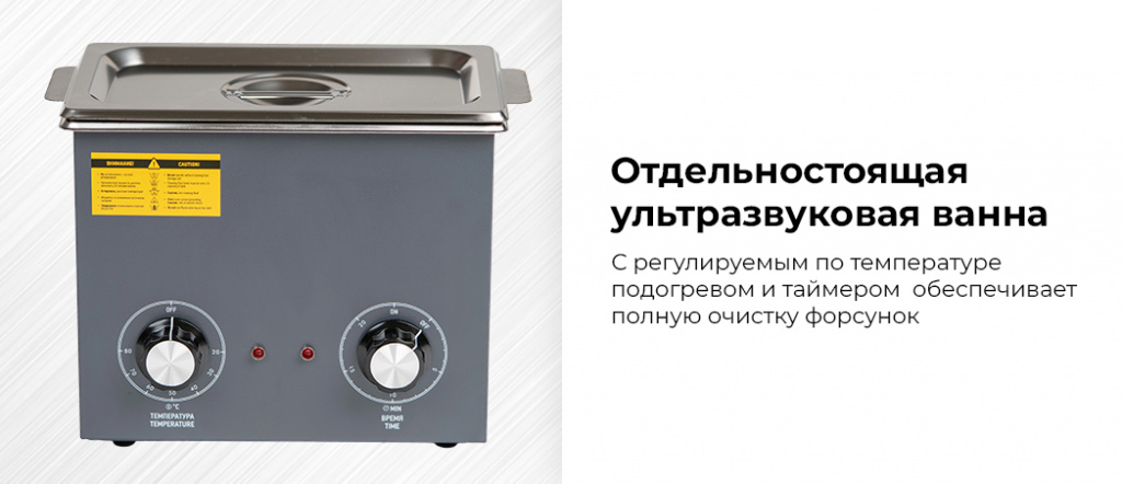 • Ультразвуковая очистка в ванне 120 Вт эффективно удаляет отложения и нагар, восстанавливая работоспособность форсунок;