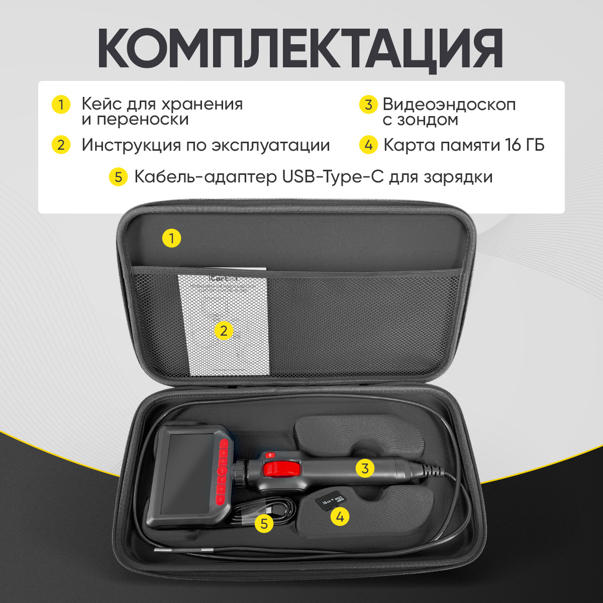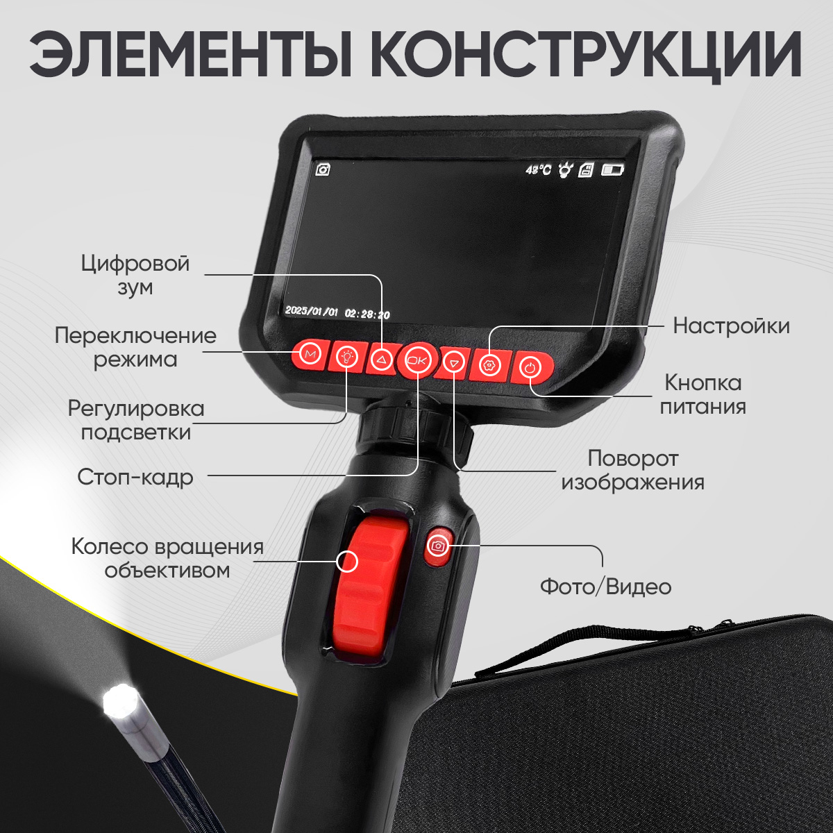 Для работы в темных местах предусмотрена регулируемая LED-подсветка. Эндоскоп работает от собственного аккумулятора до 3,5 часов.