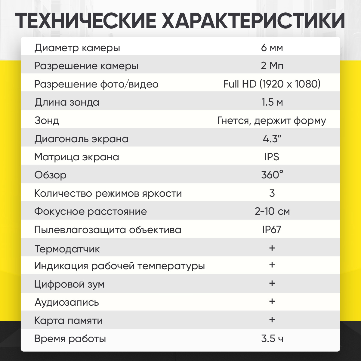 • Камера: диаметр 6 мм, разрешение 2 Мп;