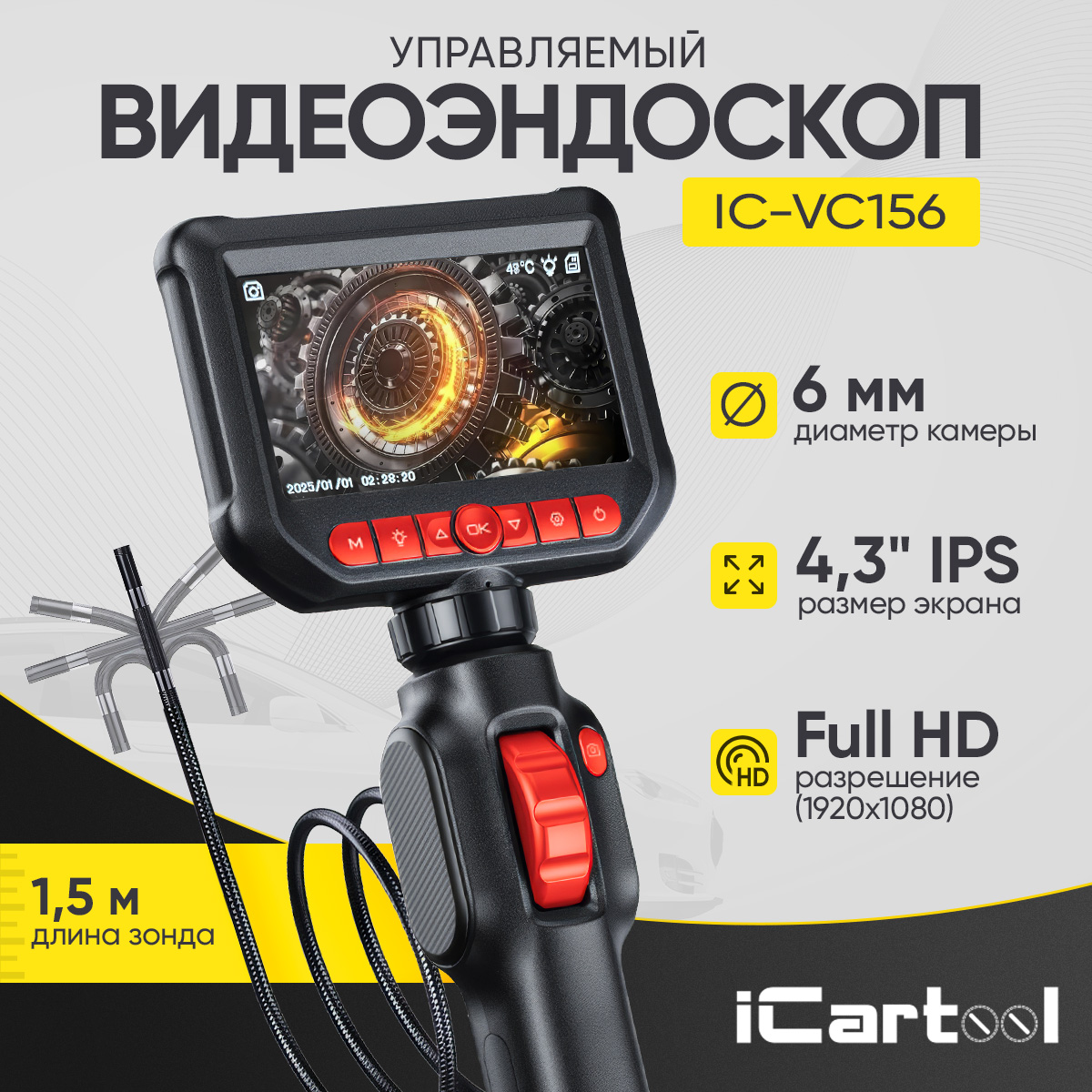 iCartool IC-VC156 управляемый видеоэндоскоп с поворотной камерой на 360° и экраном диагональю 4,3”. Экран с IPS-матрицей имеет простой и удобный интерфейс. Камера разрешением 2 Мп обеспечивает качественную картинку, а пошаговый цифровой зум помогает рассмотреть мелкие детали.